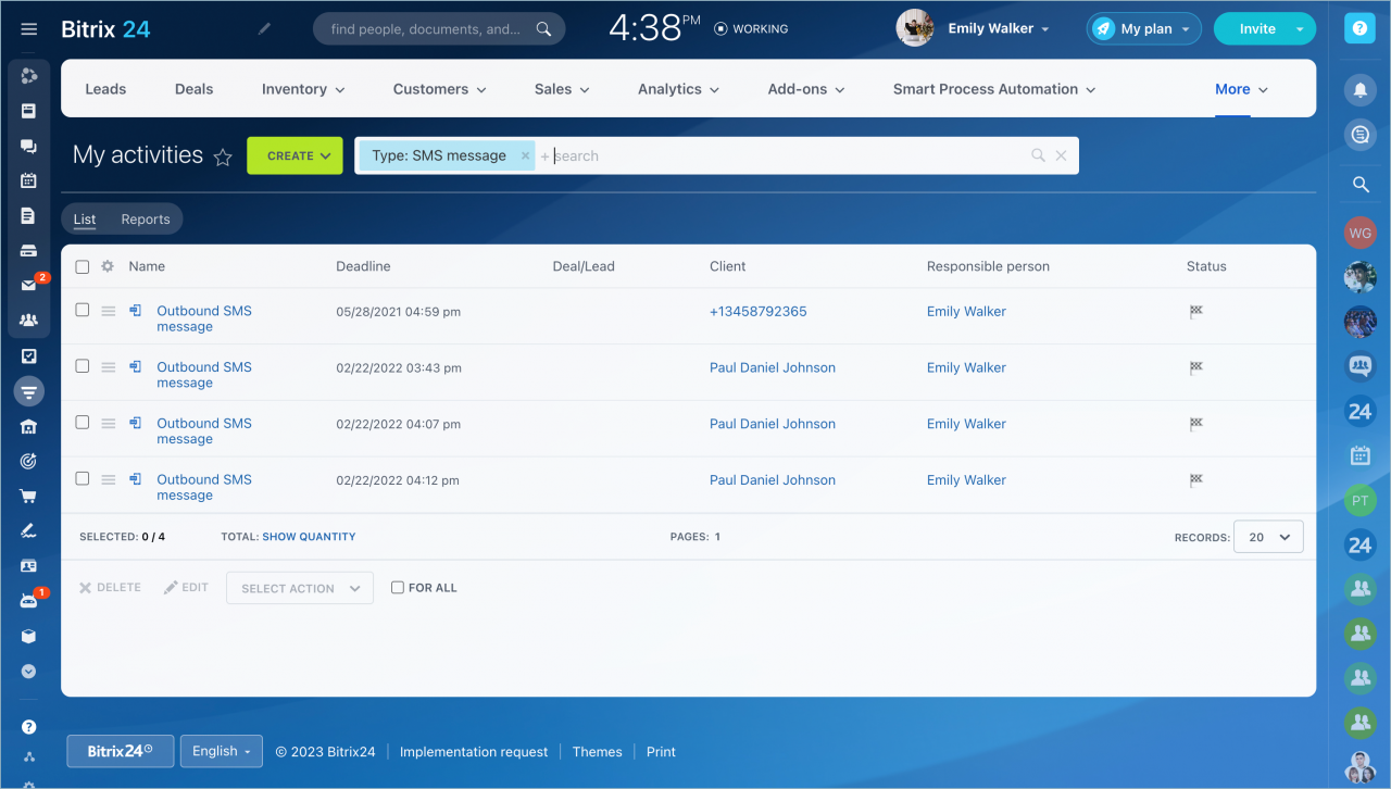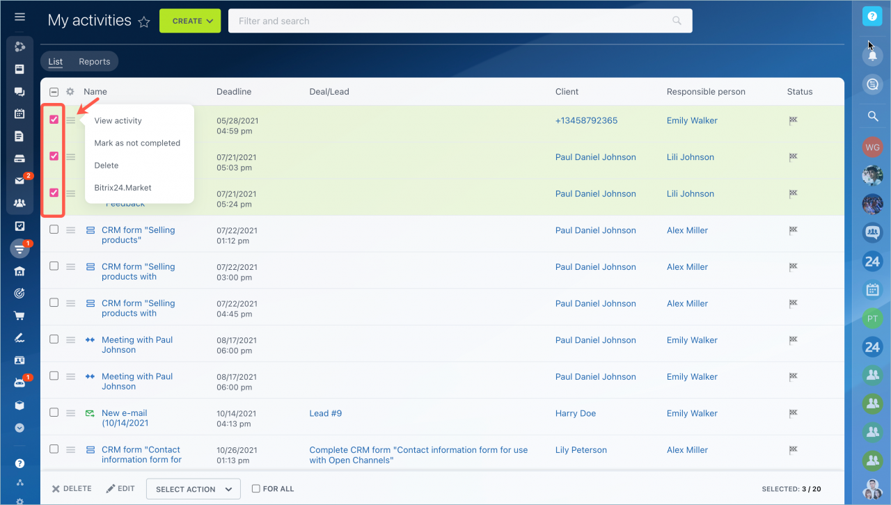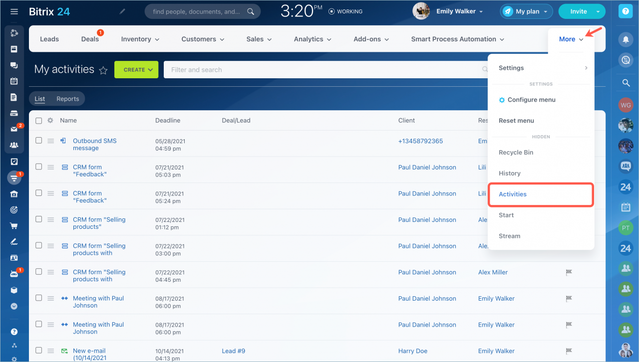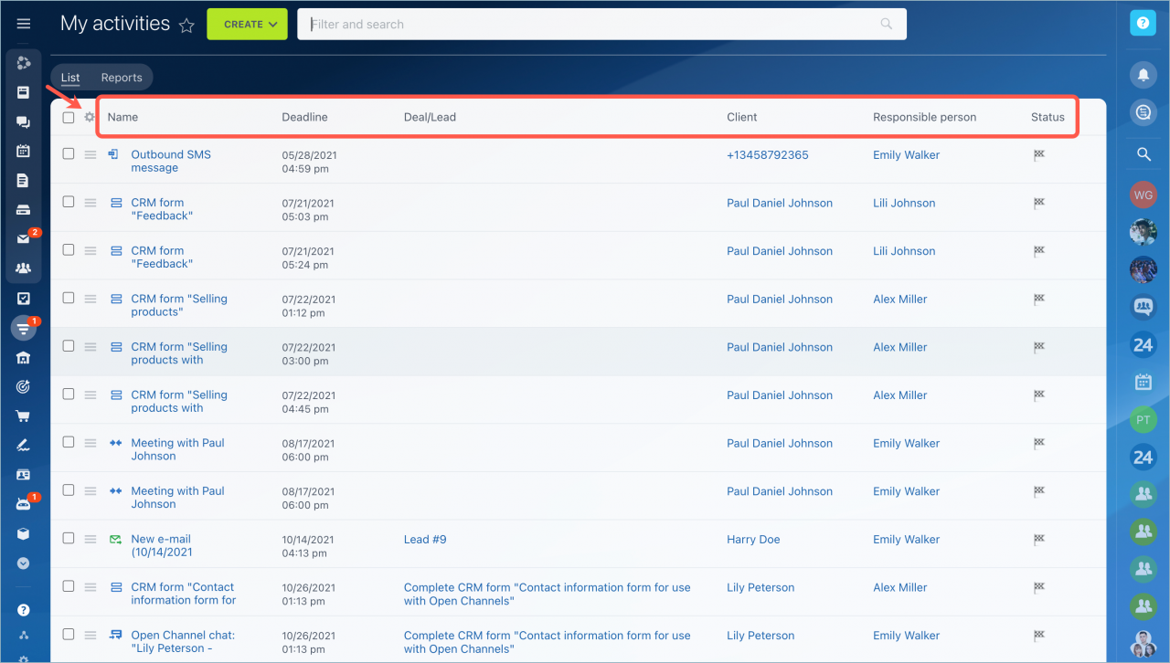 Bạn có muốn biết những hoạt động mà đồng nghiệp của bạn đã lên kế hoạch trong tuần không ? Bạn có thể tìm thấy thông tin này trong phần Hoạt động. Bạn cũng có thể tạo các báo cáo khác nhau: tải theo trình kết nối, tổng tải theo cuộc gọi và tin nhắn, v.v.