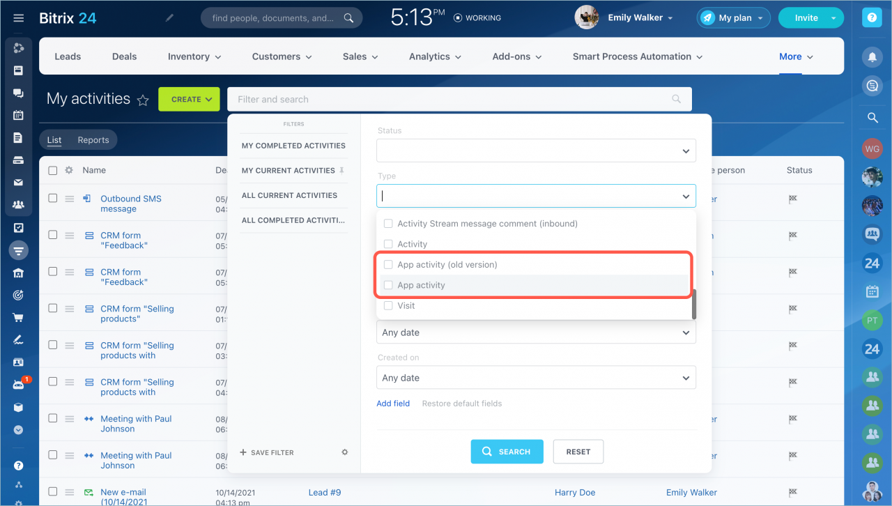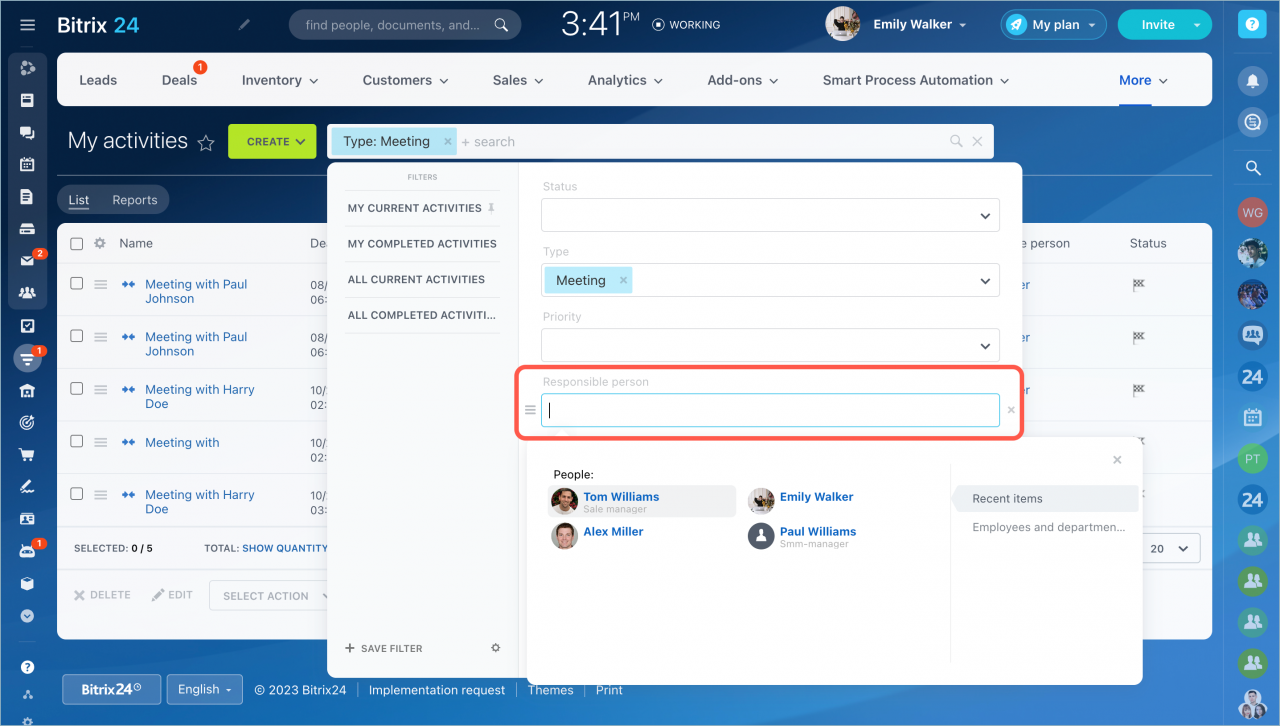 Nếu bạn có quyền truy cập, bạn cũng có thể xem hoạt động của các nhân viên khác. Để thực hiện việc này, hãy chọn người dùng trong trường bộ lọc Chịu trách nhiệm.