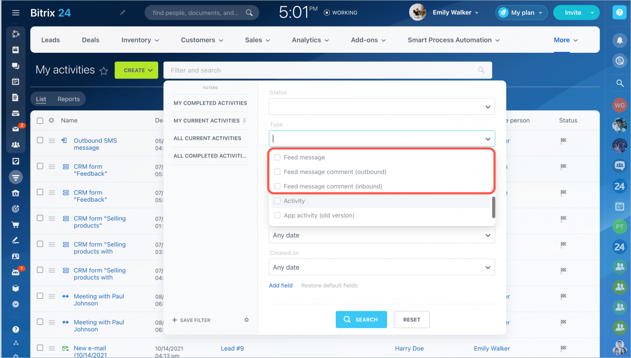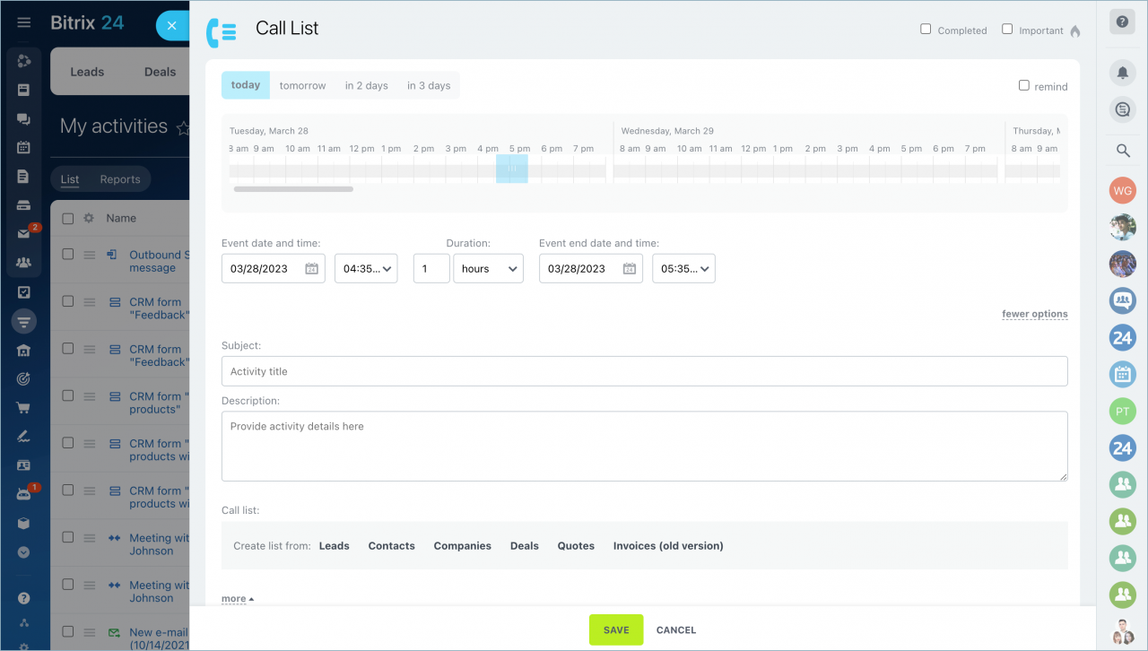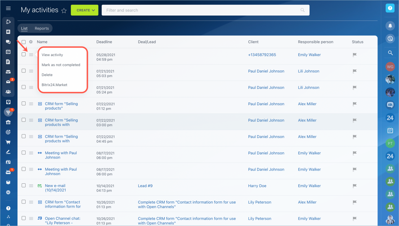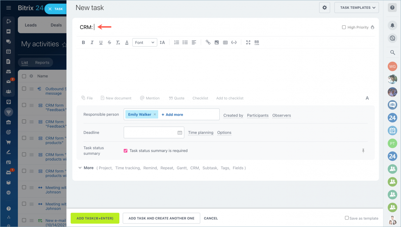 Tạo một nhiệm vụ trực tiếp từ phần Hoạt động. Tiêu đề của nó sẽ bắt đầu bằng "CRM:".