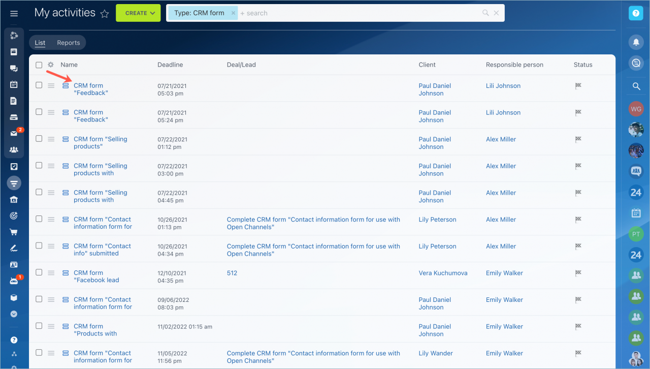 Danh sách hiển thị biểu mẫu CRM đã hoàn thành. Nhấp vào tên của biểu mẫu và một thanh trượt với các chi tiết sẽ được hiển thị.