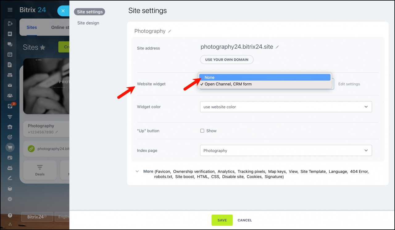Tùy chọn này phù hợp cho cả hai trường hợp: khi trang web được tạo trong Bitrix24 hoặc một CMS khác. Việc tắt tiện ích trang web sẽ xóa tiện ích này trên tất cả các trang web mà tiện ích này đã được kết nối. Kích hoạt lại nó sẽ kết nối lại nó với tất cả các trang web.